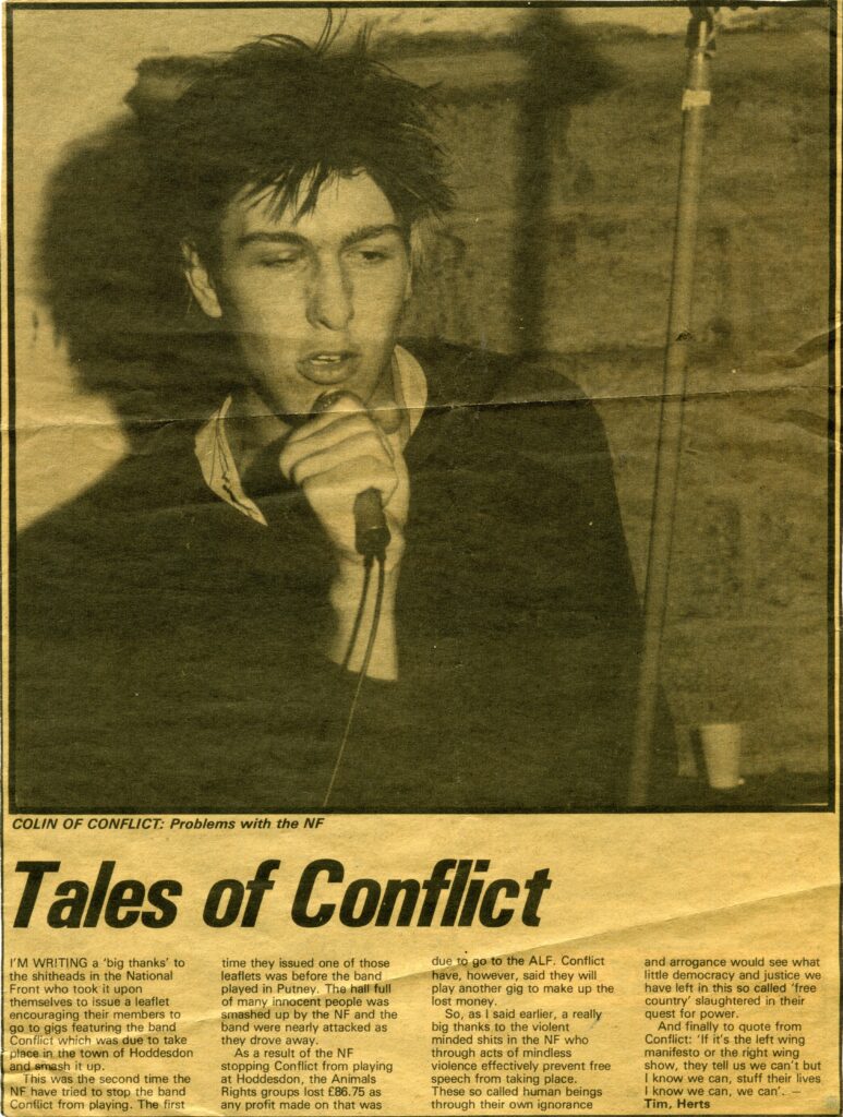 [Penguin remembers Conflict were meant to perform at the Tudor Hall in Hoddesdon, a gig that Tim from Necro part organised but sadly never happened due to threats to the venue from the N.F skinheads in the area on the afternoon of the gig. Some of the crowd expecting to attend this gig were already in the area when it was cancelled, and some of them had travelled some distance. They were largely left wandering around the town. This aborted gig was later to be highlighted by Tim via a letter to the Sounds music paper. The letter managed to end up as the main article in the Sounds letter pages!]